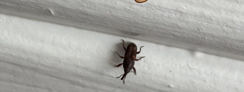 Number 7471. This is a weevil (Coleoptera: Curculionidae). If it is very small (less than 4 mm), it could be one of the granary weevils in the genus Sitophilus. Just to be safe, you should check all food storage areas for signs of insect infestation. See weevil detailed information