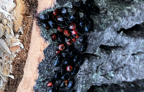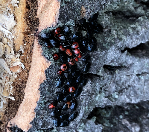 6631. These beetles were found in Winnipeg, Manitoba on a stump. The stump was not rotten only a few weeks ago was the tree cut down. Some of the beetles appeared all black and some were bright red and black. They were about 1/4 inch long. It is about 16-20 degrees Celsius today. Winnipeg, Manitoba. Canada