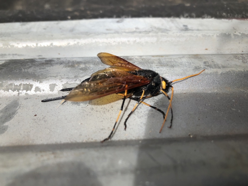 Number 7081. This is a native species; it’s Urocerus californicus, a woodwasp/horntail (Hymenoptera/Siricidae), Click here. Woodwasps lack venom and are harmless to humans.